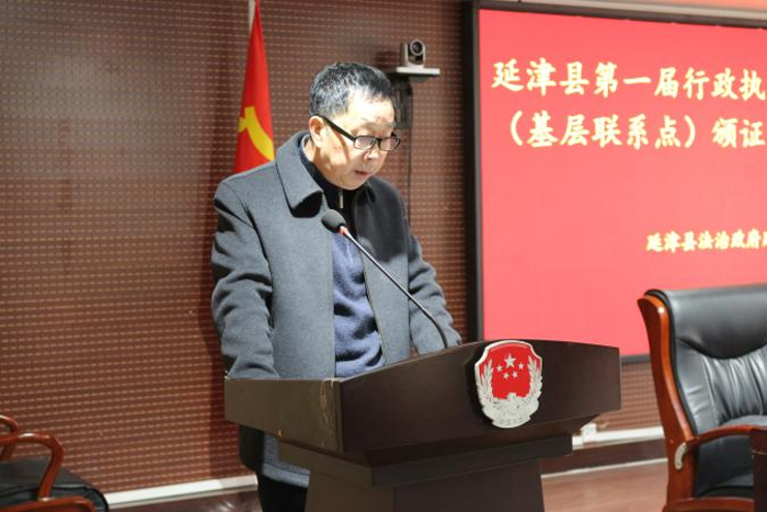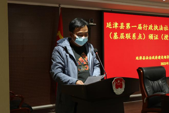 为进一步拓宽行政执法监督渠道,建立行政执法监督深入基层的常态化机制,促进行政执法单位规范公正文明执法,营造法治化的营商环境,2月15日,延津县举办第一届行政执法社会监督员(基层联系点)颁证(授牌)仪式,县政府副县长、公安局局长宋振军,县政府发展研究中心主任陈青胜,司法局党组书记、局长蔺玉澍,各乡镇(街道)、县直行政执法单位分管领导及行政执法社会监督员、行政执法监督基层联系点单位负责人参加会议。