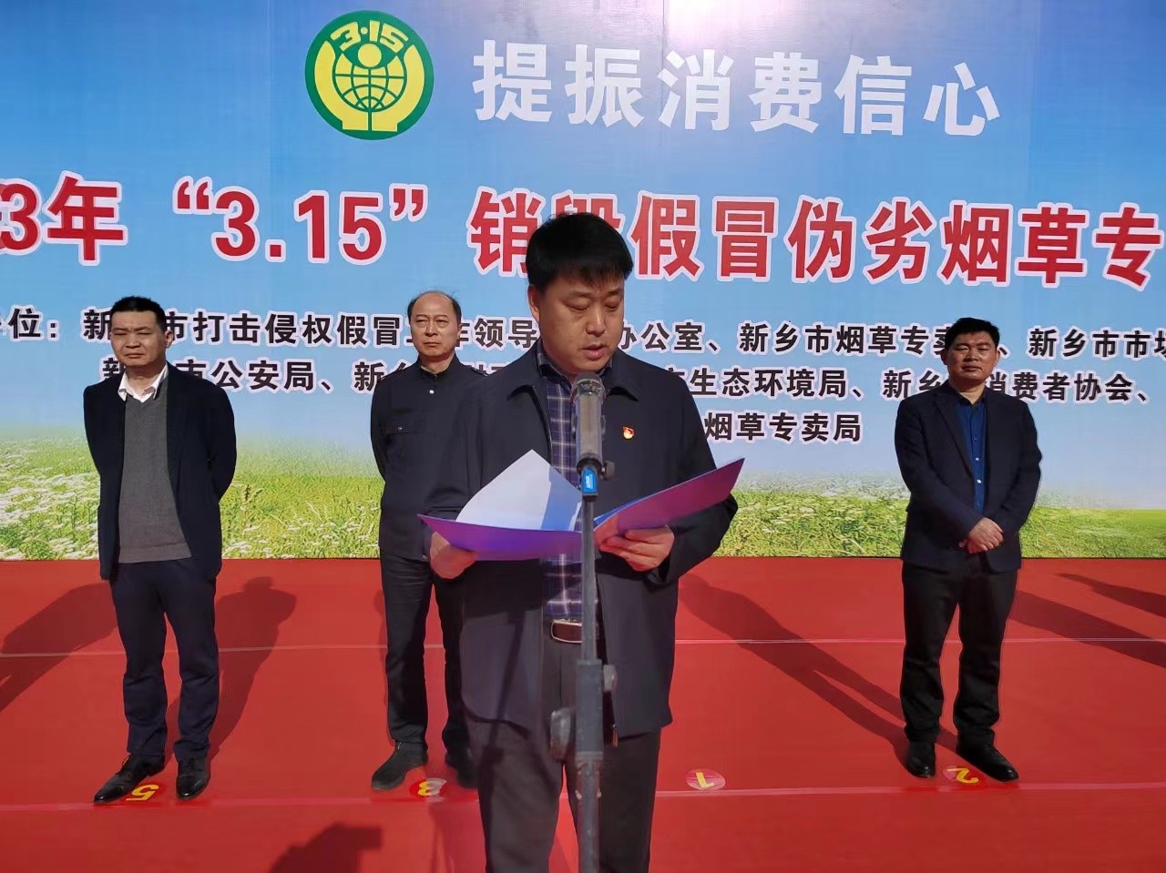 3月14日,新乡市2023年“3·15”销毁假冒伪劣烟草专卖品活动在该县举行,市双打办主任、市场监管局党组成员、副局长臧惠春,副县长田鹏,市县有关部门负责人参加活动。