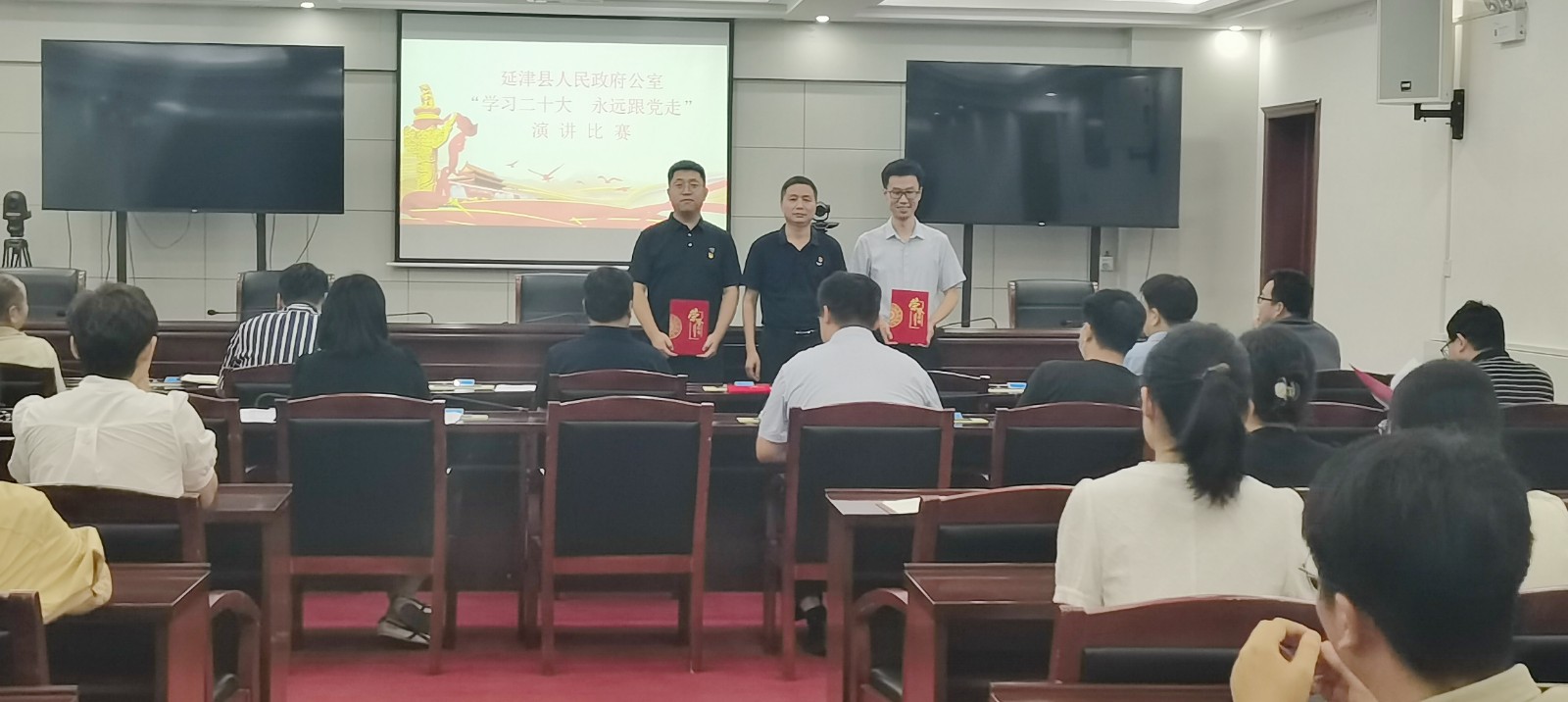 赛前,来自各股室的青年干部积极踊跃报名参加,在完成工作任务的前提下积极准备本次比赛赛中他们紧紧围绕“学习二十大 永远跟党走”主题,有的结合自身的成长经历和工作岗位,畅谈学习党的二十大精神的收获;有的讲述身边典型人物的先进事迹;有的表达勇担使命开新局的坚定意志,充分展现新时代青年干部立足岗位、奋勇向前、踔厉奋发的精神风貌。整场比赛,精彩纷呈,高潮迭起,讲述青年干部在新征程上的责任担当,抒发对党忠诚,表达兴党之志,生动展现了办公室青年干部坚守初心、爱岗敬业、勇担使命的良好精神风貌,赢得了在场评委和观众的阵阵热烈掌声。经过1个多小时的激烈角逐,评委从演讲内容、语言表达、仪表态、综合效果个方面对选手进行打分,评选出一等奖2名,二等奖1名,三等奖1现场为获奖选手颁发了荣誉证书。