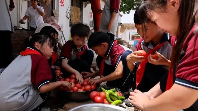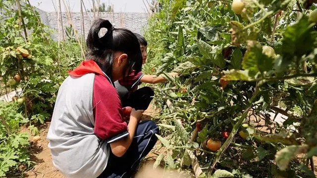6月25日,走进新乡市延津县榆林乡石堤小学,校园内一片绿意盎然,瓜果飘香,西红柿、茄子、辣椒等农作物长势正旺。同学们正忙着除草、采摘,再将自己亲手摘下的番茄做成香喷喷的番茄炒鸡蛋。