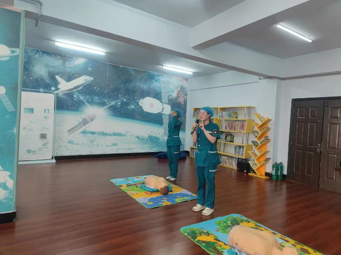 本次活动邀请了县人民医院急诊医学科专业医务人员给孩子们带来一场健康急救知识讲解,活动中医务人员以通俗易懂的语言为大家详细讲解了心肺复苏救助法相关急救知识,为了让孩子们深刻掌握急救技能和方法,医务人员现场亲自做了模拟示范,所有孩子们认真聆听,仔细观察,现场气氛十分活跃,最后小读者们积极踊跃地要求参与实际操作,在医务人员耐心的指导下,小读者们一一体验了心肺复苏的实践操作。