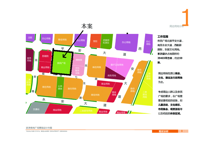 8. 广场形态应与周边相统一,并考虑轴线及南(绿化带)北地块的用地性质。