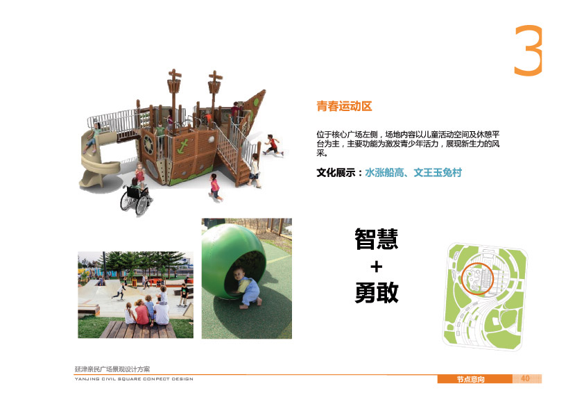 3. 儿童游乐部分,沙坑中心放一个木船,象征沙漠行舟。具体形态可以是木船或者雕塑